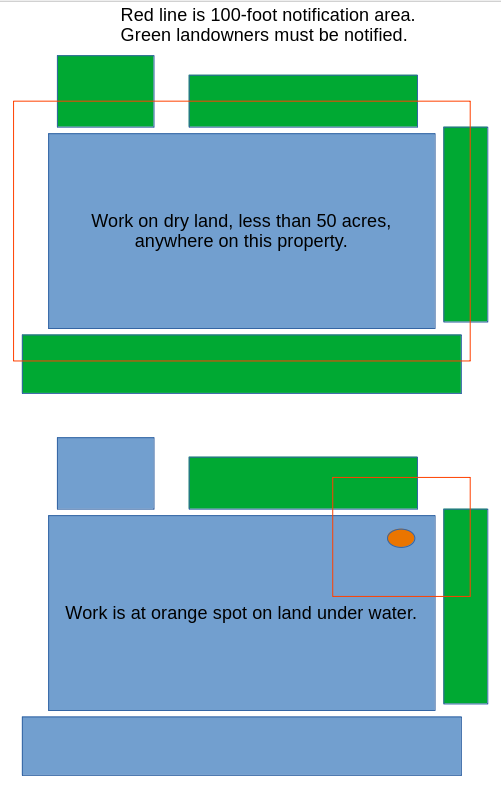 Recap: Work on dry land covering less than 50 acres requires notifying landowners within 100 feet of the property boundaries. Work on land under water or covering more than 50 acres requires notifying landowners within 100 feet of the project site.